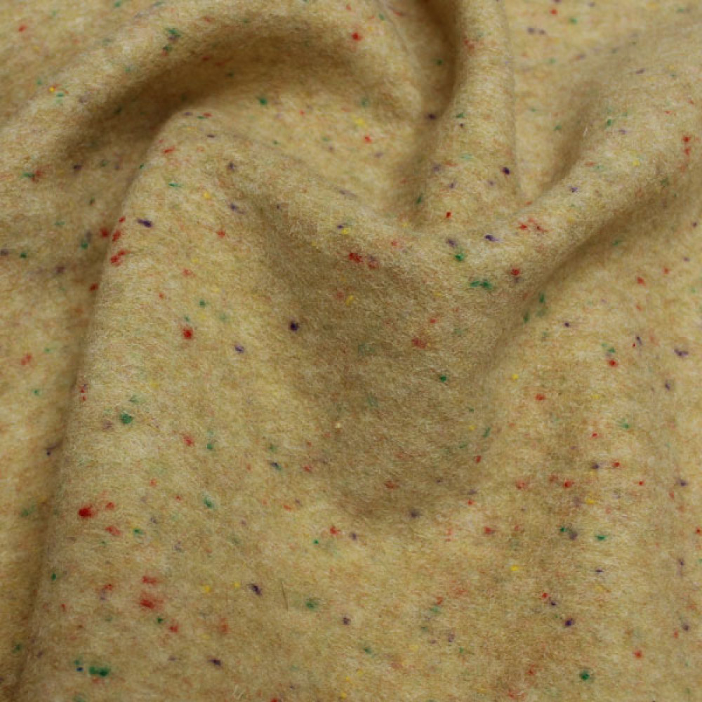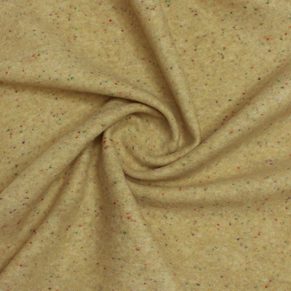 - Внешний вид и тактильные ощущения: Поверхность ткани имеет мягкий, уютный, слегка начесанный ворс (лоденовый эффект), который придает материалу матовость, благородную фактурность и тактильную мягкость. Ткань не колется, приятна к телу. Бежевый цвет — это спокойный, нейтральный оттенок, который не выгорает на солнце и обладает высокой сочетаемостью.